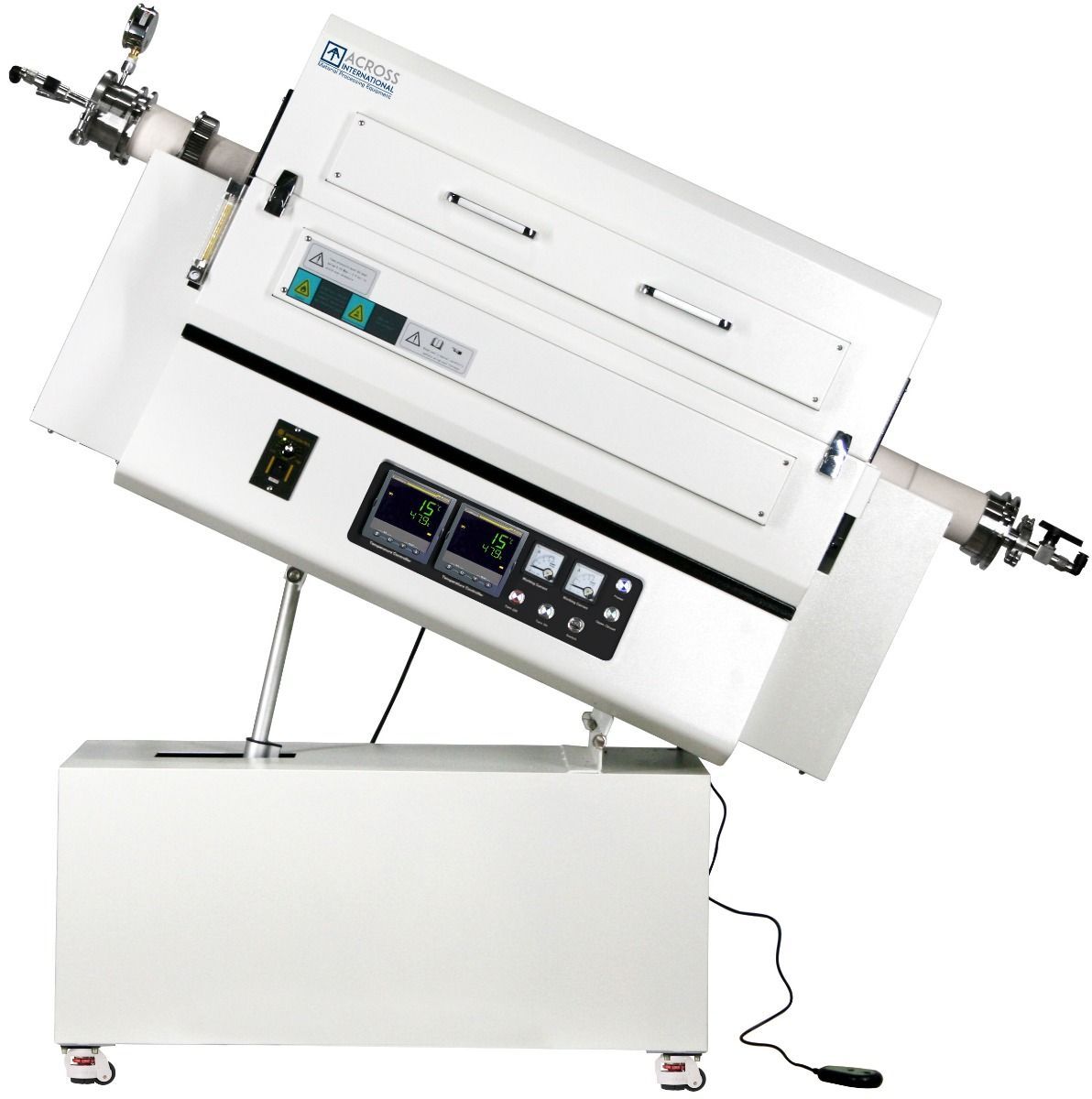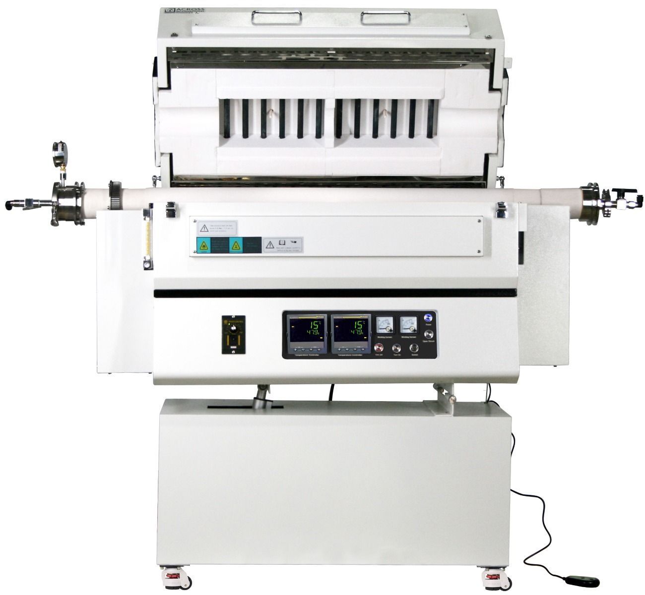 RTF1500 series top-open rotary and tilting top-open tube furnaces feature a chamber with Mitsubishi (Japan) high quality alumina fiber insulation and SiC heating elements. A dual-wall steel internal housing helps minimize heat loss to exterior surface. Furnace operation is controlled by Eurotherm (UK) multi-segment digital controller with built-in RS485 digital communications port and USB adaptor, allowing the user to connect to a PC for remote control and monitoring of the furnace.