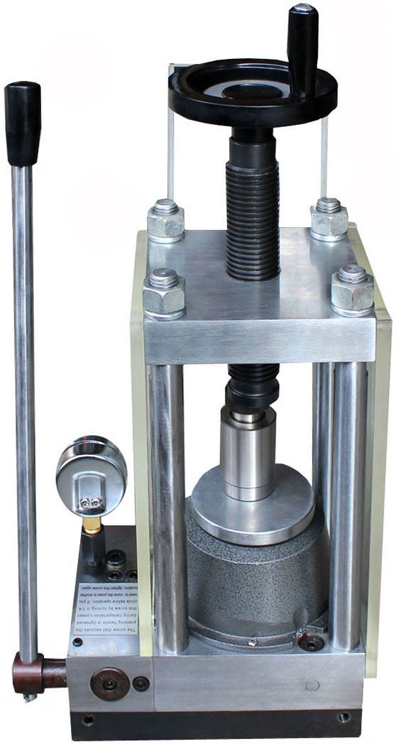 MP24A desktop dry manual pellet presses can press up to 24 metric tons. They are frequently used in materials and chemistry research laboratories to prepare compound samples. These presses have built in hydraulic pump with auto return function and 10mm thick transparent safety shield. Caution: always wear protective goggles during operation!