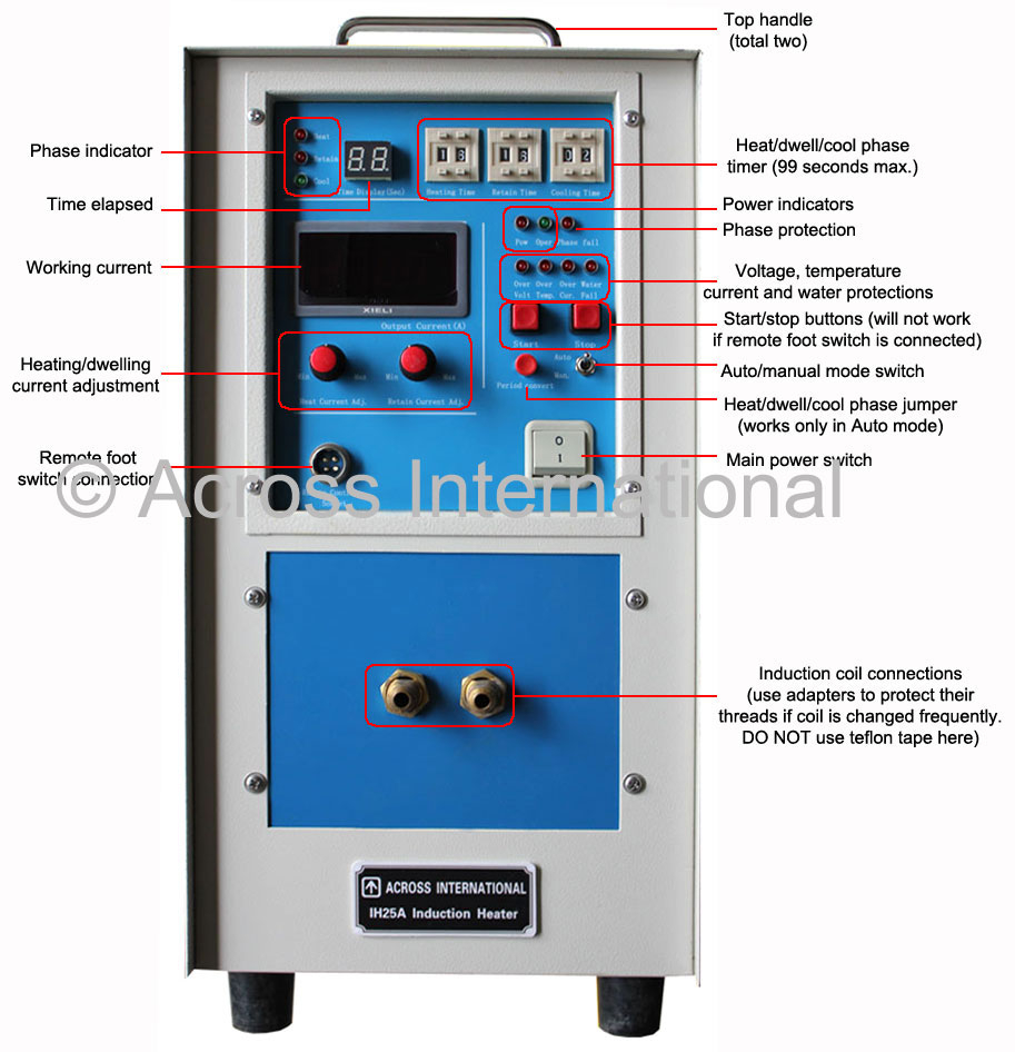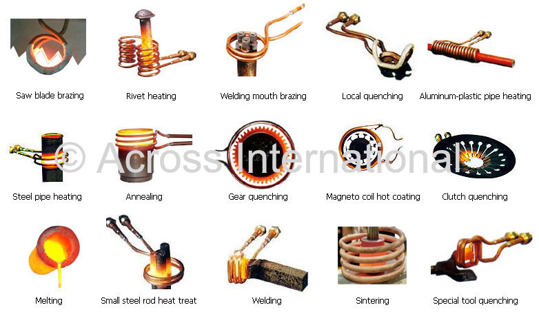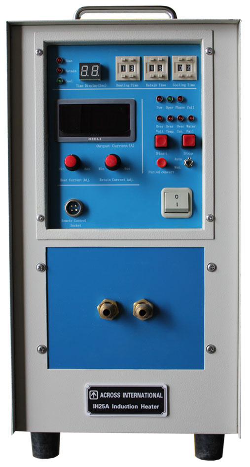 Across International IH series mid-frequency induction heaters are designed to operate between 30 and 80 kHz. Mid-frequency heaters are excellent for small parts heating, cutting, diamond tool brazing, soldering copper plumbing fittings, auto parts heat-treating, annealing of stainless steel containers and more.