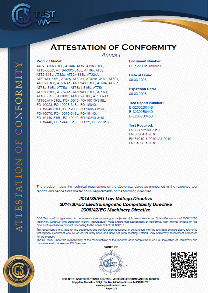 - EN1050:1996, EN294:1992, EN60204-1:2006