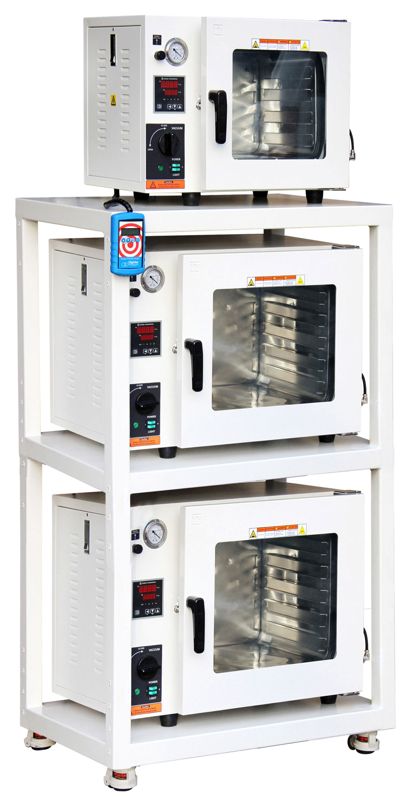 Across International heavy duty powder coated steel mobile cart with two removable and adjustable side shelves. Fits our 0.9 and 1.9 cubic foot vacuum and forced air convection ovens. This listing is for the mobile cart ONLY, vacuum ovens, pumps, and accessories sold separately.