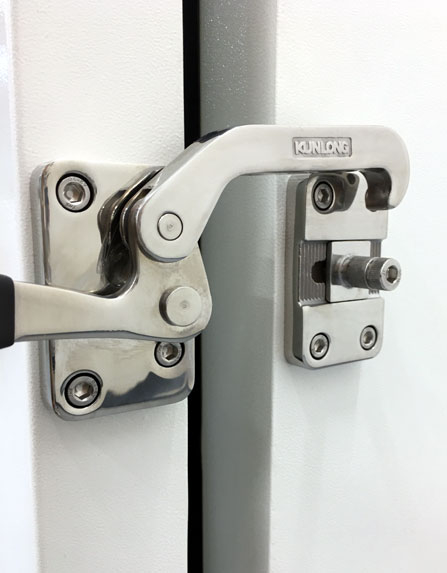 • New stainless steel, easy-open handle with tension adjustable latch (110V model).