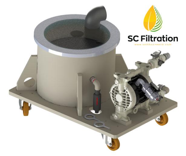 This is a Polypropylene molded plastic filter trolley. This machine is tough, durable, and almost indestructible. PP is impervious to Nitric, Hydrochloric, and similar acids or bases and easily handles Ethanol, Isopropyl, and most other solvents. Our trolley comes with an included diaphragm pump which does the job of active vacuum to filter through the filter paper; no vacuum pump is required. This is a pneumatic pump so there is no risk of sparks. An air compressor is required to supply this machine with compressed air. To operate we place filter paper over a removable grate, then place a seal around the filter paper to prevent leaks. This takes a few minutes to install and even faster to take apart. Add your tincture and begin filtering.