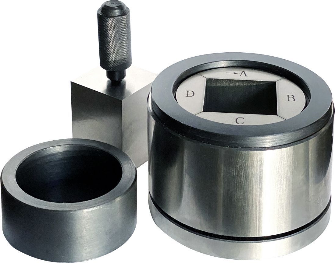 A set of 50 x 50 mm hardened steel trapezoidal split sleeve dry pressing die set for pellet presses, ready for you to make 50 x 50 mm square pellets. These die sets are professionally built for you to work with samples that tend to stick to the inner surface of the sleeve, trapezoidal split inner sleeves with pellet ejector make sample releasing a snap.