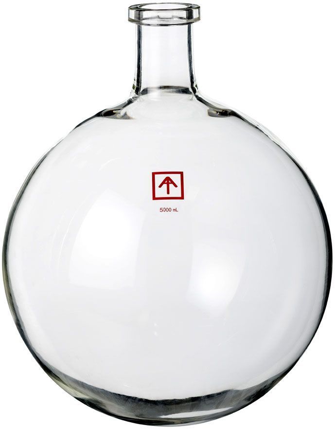 Ai 5L heavy wall, high quality round evaporation flask for SolventVap 5L rotary evaporators. Outer diameter: 8.5 inches, mouth OD: 2 inches, mouth ID 1 3/8 inches, glass material: high borosilicate glass 3.3.