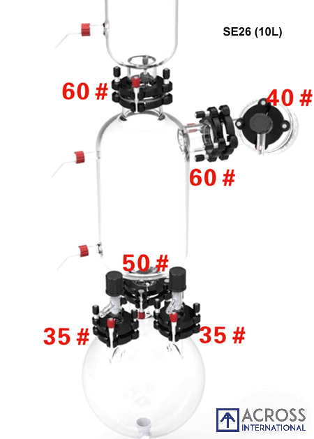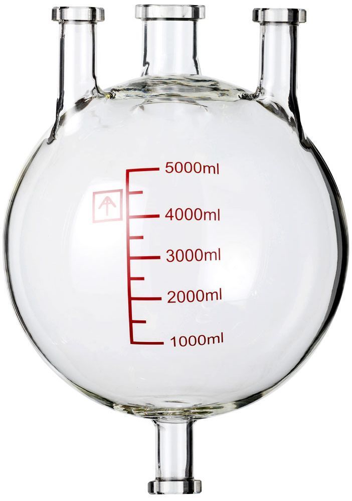 5L heavy wall, high quality receiving flask for Ai SolventVap 10L rotary evaporators. Outer diameter: 8.5 inches Vacuum and drainport QuickClamp size: 35# Auxiliary condenser port QuickClamp size: 50# Glass material: high borosilicate glass 3.3