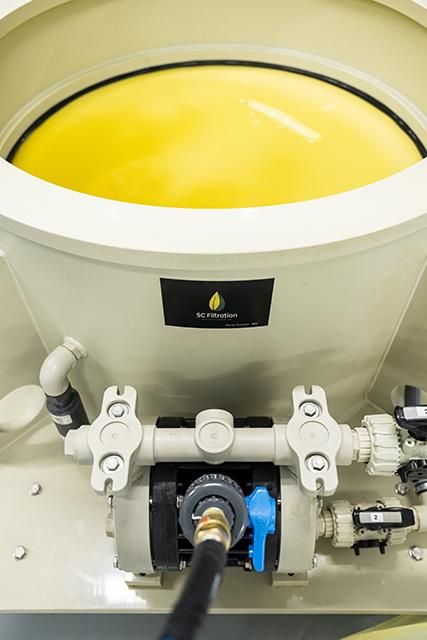 This is a Polypropylene molded plastic filter trolley. This machine is tough, durable, and almost indestructible. PP is impervious to Nitric, Hydrochloric, and similar acids or bases and easily handles Ethanol, Isopropyl, and most other solvents. Our trolley comes with an included diaphragm pump which does the job of active vacuum to filter through the filter paper; no vacuum pump is required. This is a pneumatic pump so there is no risk of sparks. An air compressor is required to supply this machine with compressed air. To operate we place filter paper over a removable grate, then place a seal around the filter paper to prevent leaks. This takes a few minutes to install and even faster to take apart. Add your tincture and begin filtering.