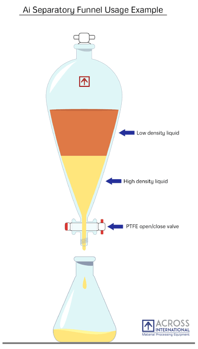 Introducing the new Ai separatory funnel kits with all PTFE valves. A separatory funnel, also known as separation funnel, separating funnel, or colloquially sep funnel, is a piece of laboratory glassware used in liquid-liquid extractions to separate (partition) the components of a mixture into two immiscible solvent phases of different densities. Typically, one of the phases will be aqueous, and the other a lipophilic organic solvent such as ether, MTBE, dichloromethane, chloroform, or ethyl acetate. All of these solvents form a clear delineation between the two liquids. The more dense liquid, typically the aqueous phase unless the organic phase is halogenated, sinks and can be drained out through a valve away from the less dense liquid, which remains in the separatory funnel.