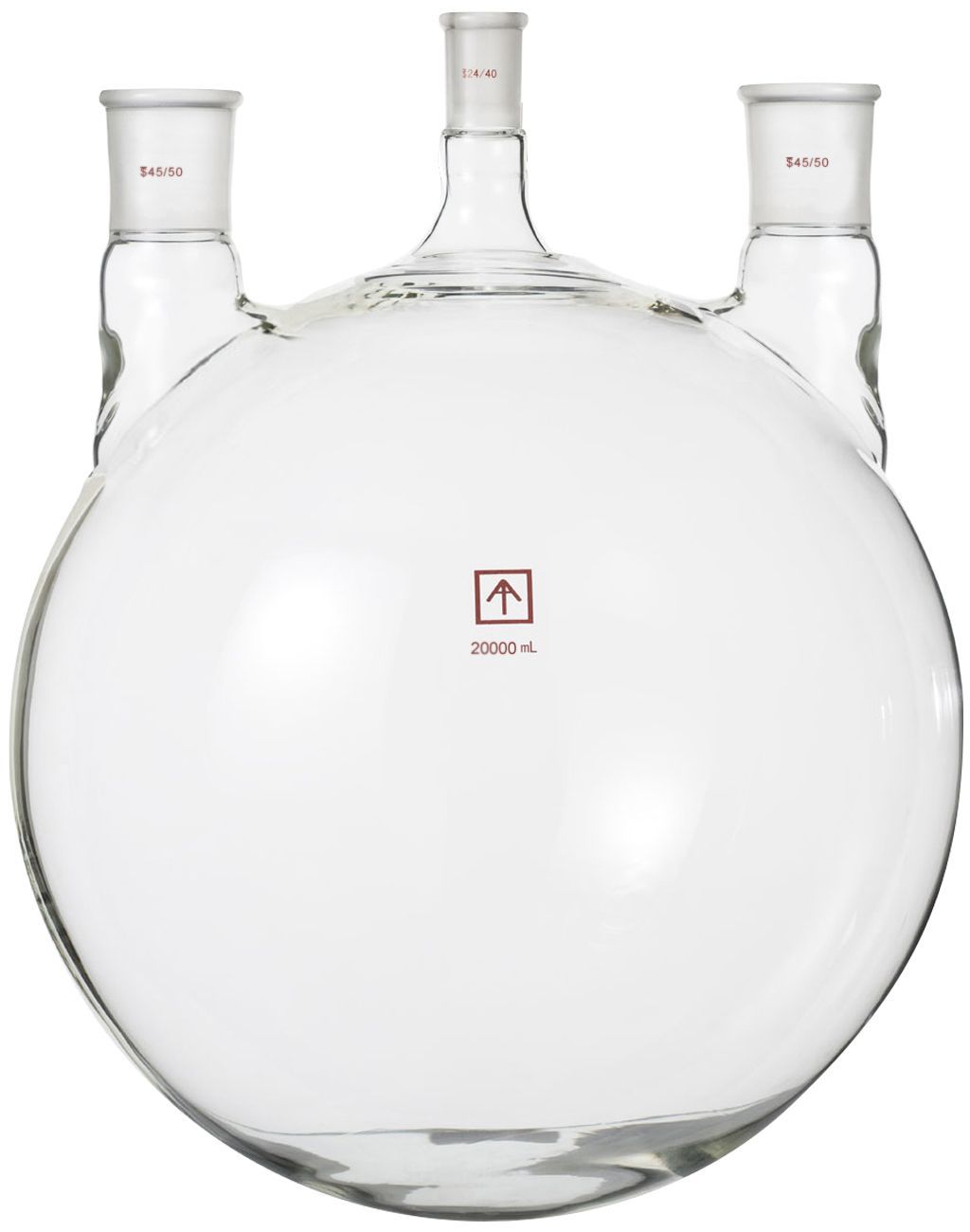 Ai 20L heavy wall, 3-neck round bottom flask with 24/40 and 45/50 standard taper joint. Comes with two vertical 45/50 side necks and one 24/40 center neck.