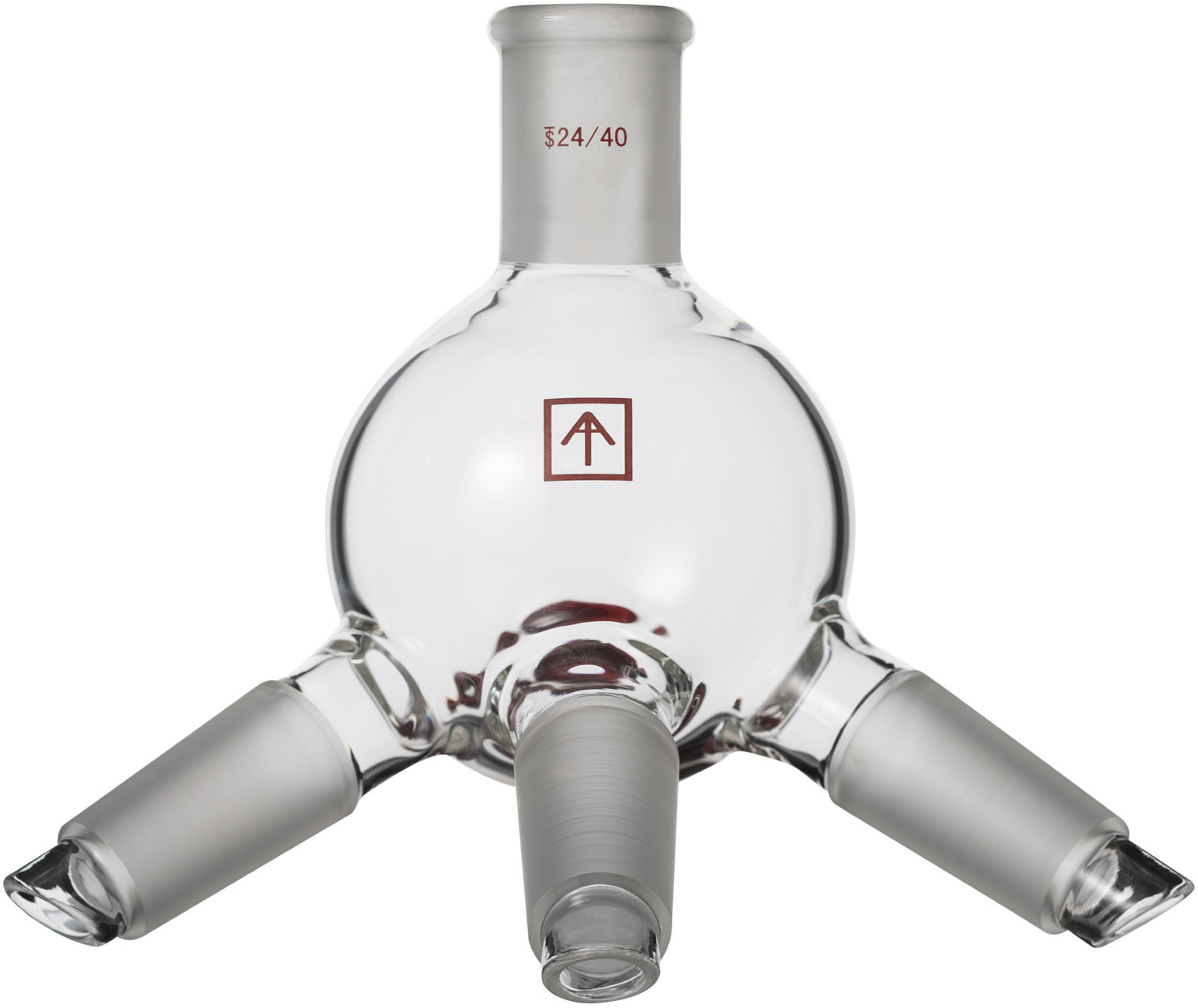 Ai 24/40 standard taper joint, heavy wall cow type distribution adapter, with three receivers 45 apart, and one 3/8″ hose barb vacuum port.