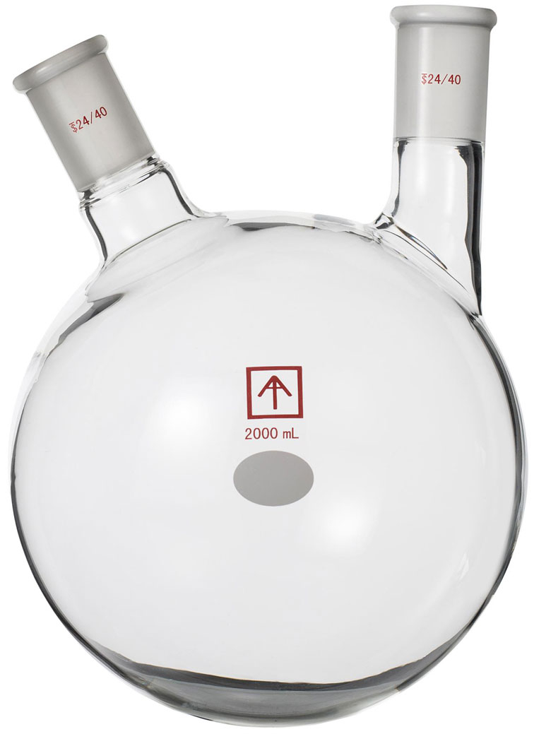 Ai 2L, 24/40 standard taper joint, heavy wall, round bottom 2-neck flask with one vertical 24/40 neck, and one angled 24/40 side neck. Glass material: high borosilicate glass 3.3. Glassware does not have warranties. Glassware may have minute blemishes that will not affect the function.