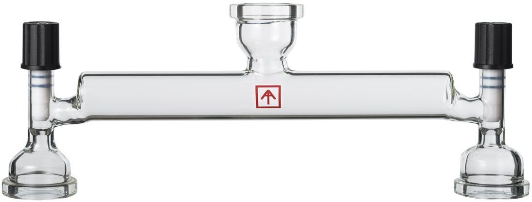 Dual receiving flask bridge for Ai 50L Solv entVap rotary evaporators. The Ai dual receiving flask setup allows you to switch between two receiving flasks, without interrupting your laboratory rotary evaporator ‘s operation. Auxiliary condenser port QuickClamp size: 60# Receiving flask port QuickClamp size: 60# Gass material: high borosilicate glass 3.3