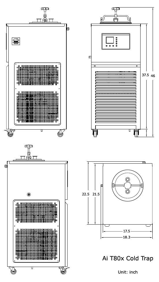 Introducing the Ai 2nd Gen -80C (-112F) T80 cold traps with a large corrosion-resistant 316L SST 5 liter trap, 316L trapping layers/vacuum connections, and PTFE encapsulated silicone sealing gasket . Upward KF25 vacuum connections provide you safer and easier vacuum tubing connection and removal. No chilling fluid required , just plug and play.