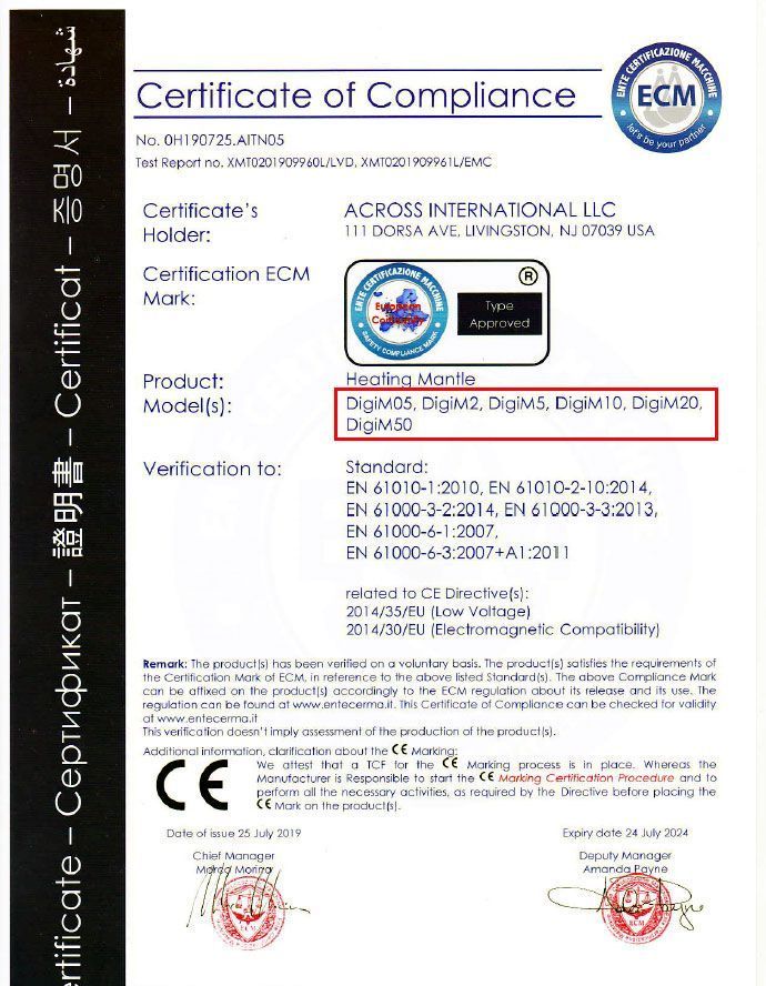 Across International heating and stirring mantles come standard with digital display for the most accurate control. The large display interface makes it easy to quickly and precisely adjust temperature and rotation speeds. The DigiM mantle is equipped with two sets of thermocouples for proper temperature and speed detection. The heating jacket is pre-treated before shipment, which ensures that no smoke or odors (caused by heat) are released into your work environment.