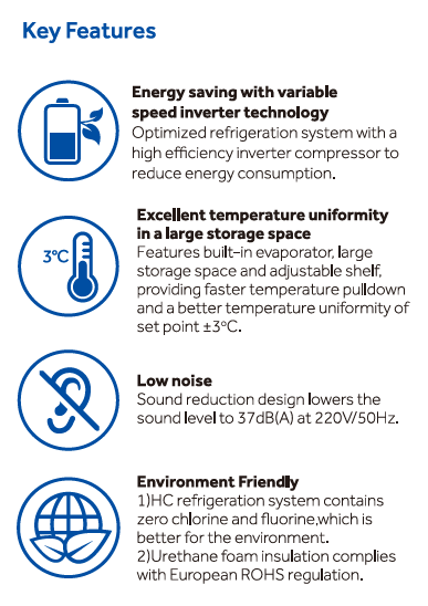 | Compressor | Cooling type: direct cooling Defrost mode: manual Refrigerant: R290 |