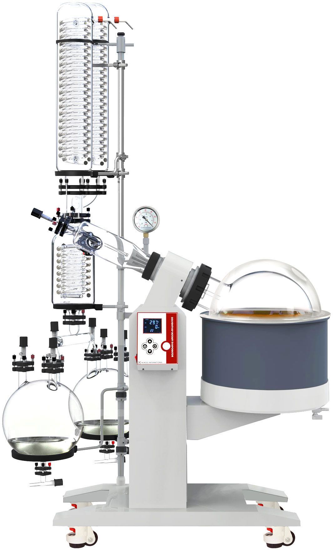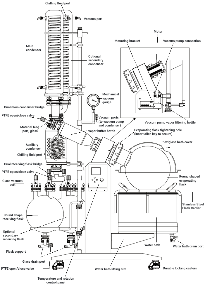 Standard Glassware Set includes 5.28 gallon (20 liters) round-bottomed evaporating flask, 2.64 gallon (10 liters) round-bottomed receiving flask, and vertical condenser. Rotary evaporators with vertical glass condenser are great for distillation of solvents with higher boiling points.