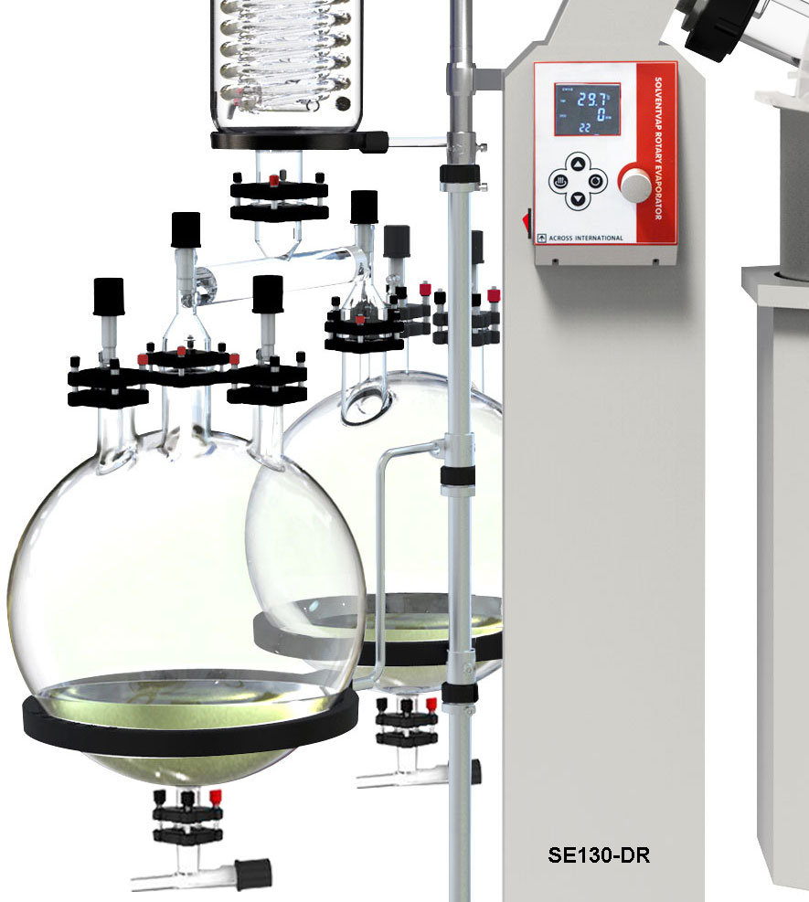 Standard Glassware Set includes 5.28 gallon (20 liters) round-bottomed evaporating flask, 2.64 gallon (10 liters) round-bottomed receiving flask, and vertical condenser. Rotary evaporators with vertical glass condenser are great for distillation of solvents with higher boiling points.