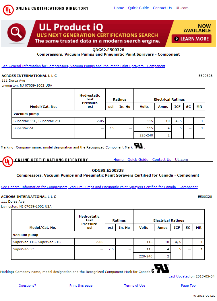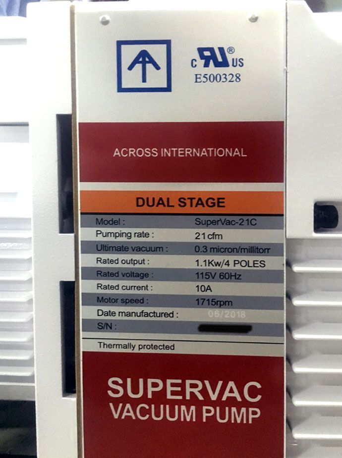 * UL certification NOT available for the 220V model The new corrosion resistant Ai SuperVac 21 cfm commercial grade vacuum pumps are now UL certified (115V model), this certification is required by many municipalities, and it also provides a higher standard of equipment safety and lifespan. These pumps are designed for reliable long time continuous operation, they will take your equipment’s vacuum down to 0.3 micron in minutes.