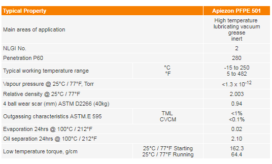 Apiezon PFPE 501 vacuum grease is a chemically inert, high temperature and extreme pressure lubricant.With an upper operating temperature of 250C and vapour pressure of 1.3 x 10-12at 25C, it is robust, versatile and can be used for sealing and lubricating under the most extreme operating conditions. This includes environments where aggressive chemicals and strong oxidising agents are regularly used.