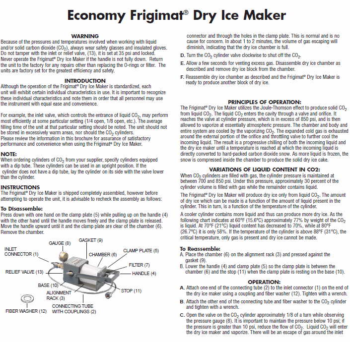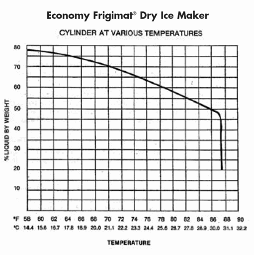 Produces a solid 454gm (16oz) block of dry ice in one to two minutes. Each 50lb. cylinder of liquid CO2 with a dip tube will make 8 or 9 blocks of dry ice measuring 9.2 x 10.4cmL (3 x 4″).