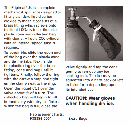 Dry ice flakes are useful for packing around irregularly shaped items and are easily produced as needed with the Frigimat Junior Dry Ice Maker. When the cylinder valve is opened about turn, LCO2 expands into the bag to create dry ice snow. The valve is then closed and the bag is ready to be removed and emptied. CO2 tank (required) NOT included.