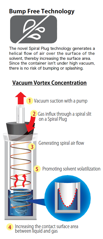Smart Evaporator with its unique spiral plug design makes it possible to evaporate solvents bump free utilizing revolutionary vacuum assisted vortex technology.