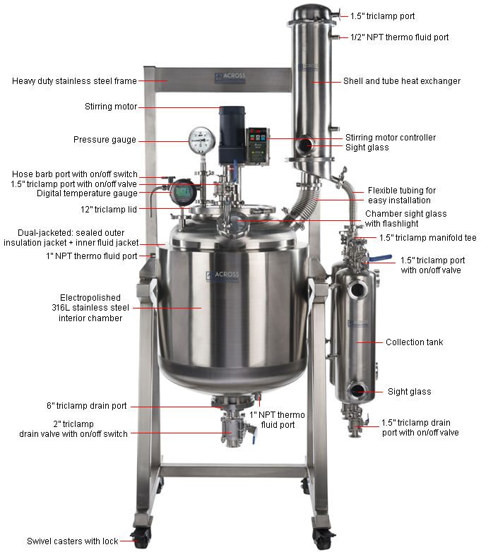 A: Across International is open to discussion about what modifications we can and cannot do, please contact your application engineer or sales representative to discuss. The common applications that we have solutions on our website for include changing the agitator in order to achieve your mixing goals for a particular material, modifying the lid to add more ports or different type of ports other than the standard 1” tri clamp, or adding a spray ball for cleaning. - Q: What is the best way to clean the reactor?
