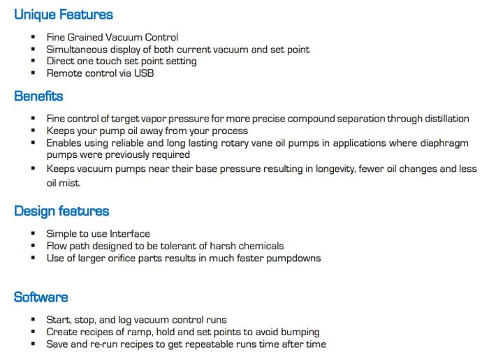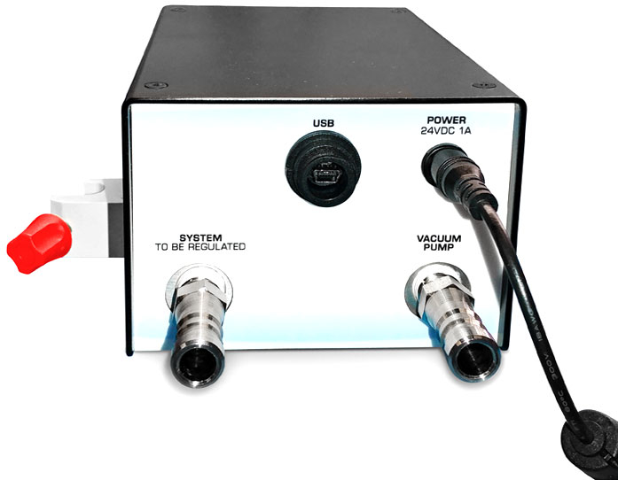The front of the gauge is similar in terms of being straightforward. It has displays of both your current vacuum and chosen setpoint, as well as a numerical up/down control, regulation button, and power switch. Just hook your vacuum pump to one side, the rotovap to the other side and plug it in. If youd like specific ramp rates and time duration, then install the free software, hook up the USB to connect the unit to the computer hosting the software and you can set up your process profile. The vacuum system is what you are going to regulate, an example being your rotovap, vessel, flask or vacuum oven. Once the unit is set up and regulating, the process can also be observed within the software, thus telling you how your system and pump are performing.