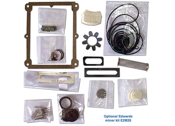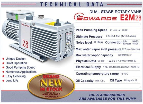Brand new Edwards E2M28 high capacity vacuum pump with one year manufacturer warranty from Edwards. E2M28 replaces the discontinued E2M30, click links below for more details. Free KF25 flexible stainless steel bellow (3.3 ft), clamps and centering rings set ($219 value) included. Technical support and one year warranty, covered by Edwards.