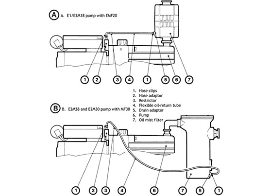 You can inspect the level and condition of oil in the oil box reservoir through the oil sight-glass. An oil filler-plug is fitted to the top of the oil box. The pump has two oil drain-plugs to allow either gravity oil drain or pressure oil drain.
