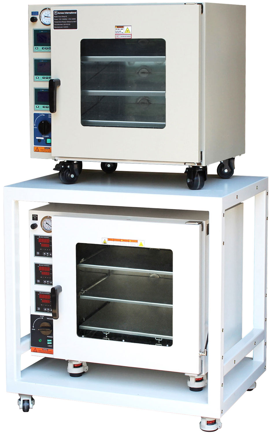 Across International heavy duty powder coated steel mobile cart with two removable and adjustable side shelves. Fits our AT32e and AT32-UL cubic foot vacuum ovens. This listing is for the mobile cart ONLY, vacuum ovens, pumps, and accessories sold separately.