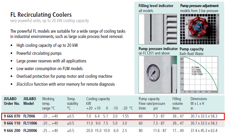 FL11006 Powerful recirculating cooler The powerful FL models are suitable for a wide range of cooling tasks in industrial environments, such as removal of large process heat. 2 variants: Air-cooled (FL) and water-cooled (FLW). JULABO FL Series Recirculating Cooler / Chillers for routine laboratory cooling applications. PID temperature control provides ±0.5°C stability.