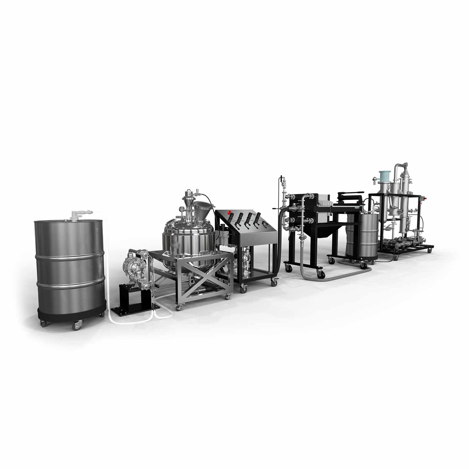 The base configuration comes with a standardized size of 100L vessel/filter press combination with all necessary ancillary equipment. The standard package can process up to 60 liters of crude oil per hThe.