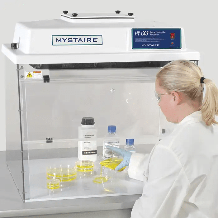 The MY-ISO 5 Series of Laminar Flow Cabinets provide an ISO 5 sterile environment for the handling of sensitive materials. The work area is continuously bathed with ISO 5 HEPA-filtered air to protect the product or application from airborne contamination. These workstations are constructed of high quality, thermal plastics to provide for ease of cleaning and maintenance. The main chamber is constructed of polycarbonate and the base is high density polypropylene.
