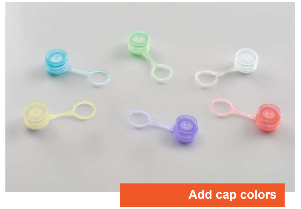 Six cap colors (blue, red, yellow, purple, green and white) for personalized identification of different types of reagents in a faster and more convenient way.