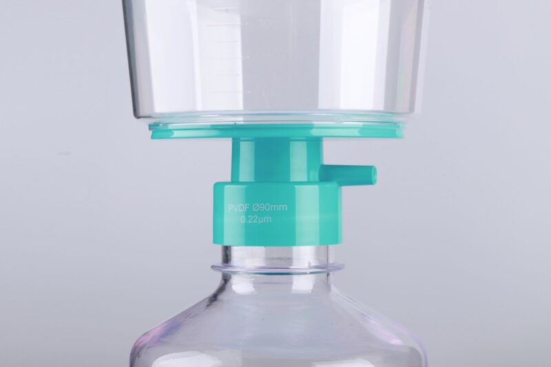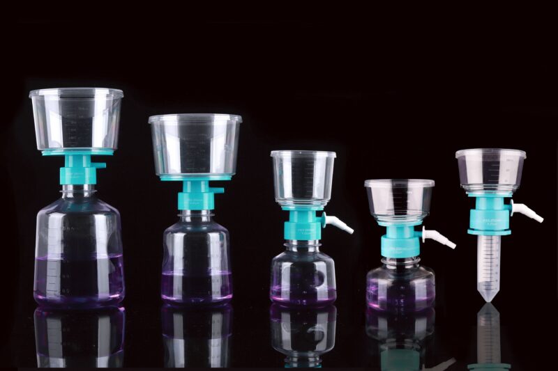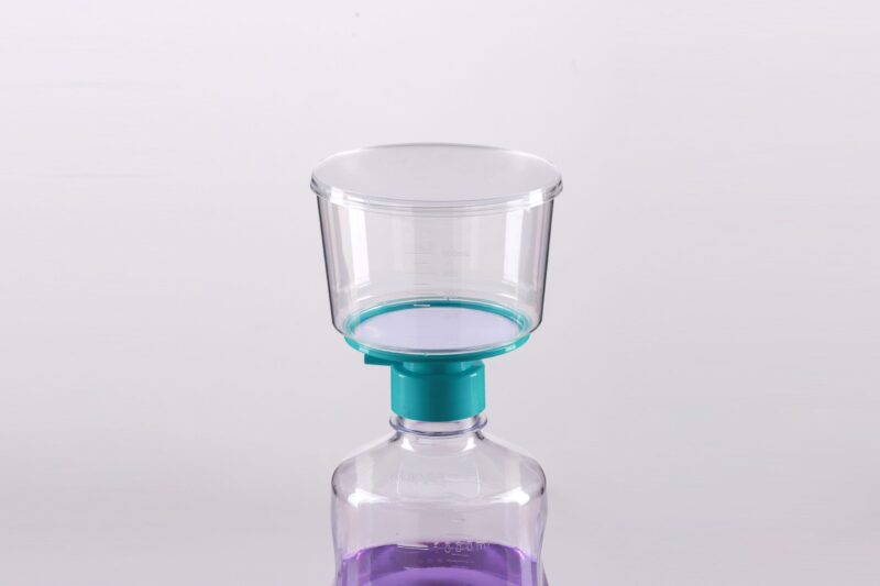 It is mainly used in tissue culture media and biological fluids for separation and purification of large volume samples. The whole set includes membrane diaphragm, a graduated, transparent polystyrene funnel connected to a receiving bottle by a connector. The disposable vacuum filter utilizes a vacuum pump to provide pressure differentials for processing large volumes of tissue culture fluids and other laboratory fluid solutions and the volume of processed samples could be up to several liters. The filtered samples can be stored directly in sterile collection bottles.