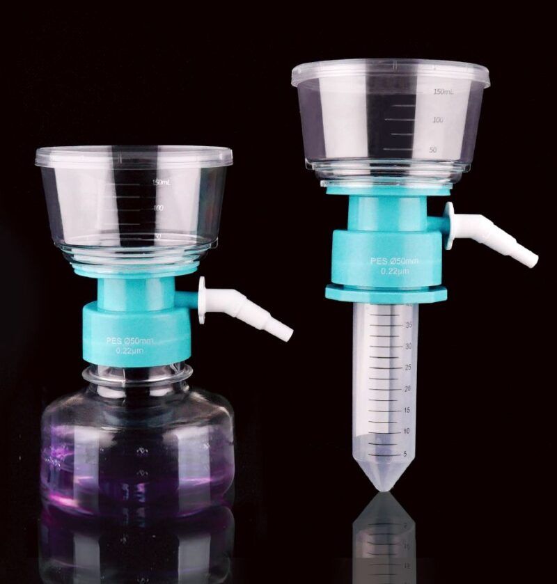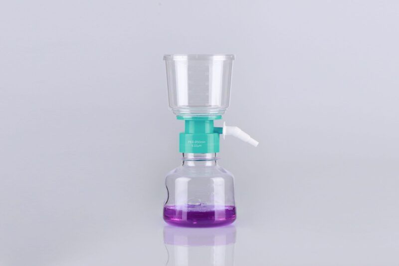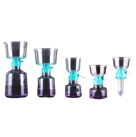 It is mainly used in tissue culture media and biological fluids for separation and purification of large volume samples. The whole set includes membrane diaphragm, a graduated, transparent polystyrene funnel connected to a receiving bottle by a connector. The disposable vacuum filter utilizes a vacuum pump to provide pressure differentials for processing large volumes of tissue culture fluids and other laboratory fluid solutions and the volume of processed samples could be up to several liters. The filtered samples can be stored directly in sterile collection bottles.