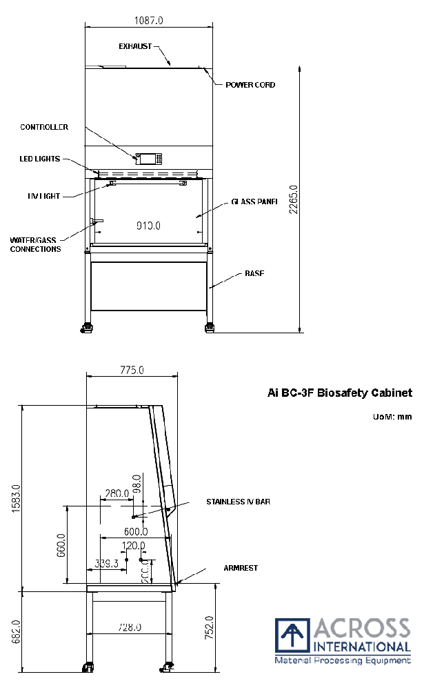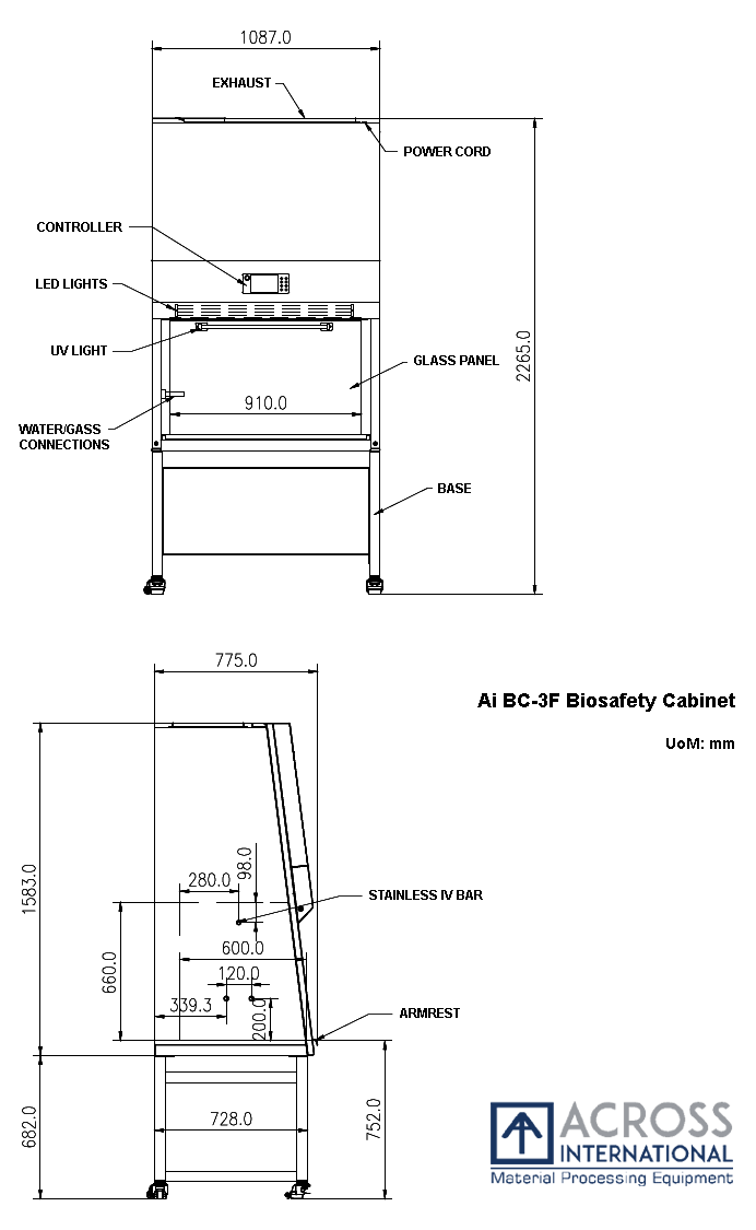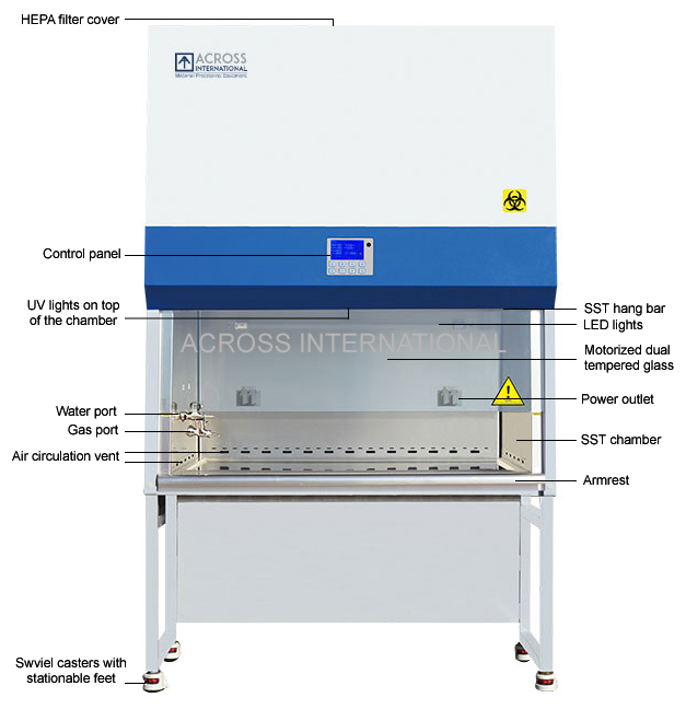 | Air flow | Volume Inflow: 255 CFM (cubic feet per minute) Downflow: 380 CFM Exhaust: 255 CFM Speed Inflow: 100-110 FPM (feet per minute) Downflow: 60-70 FPM Motor: 1/2 HP, 9A * 70% recirculated internally, 30% discharged from top vent * Air circulation available only when front glass panel is open |
