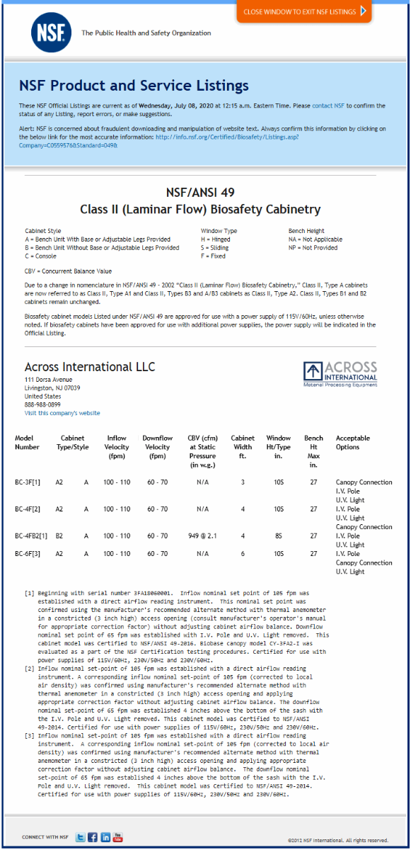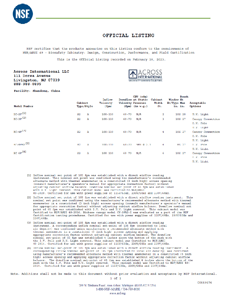 | Compliance | NSF/ANSI 49 (C0559576) |