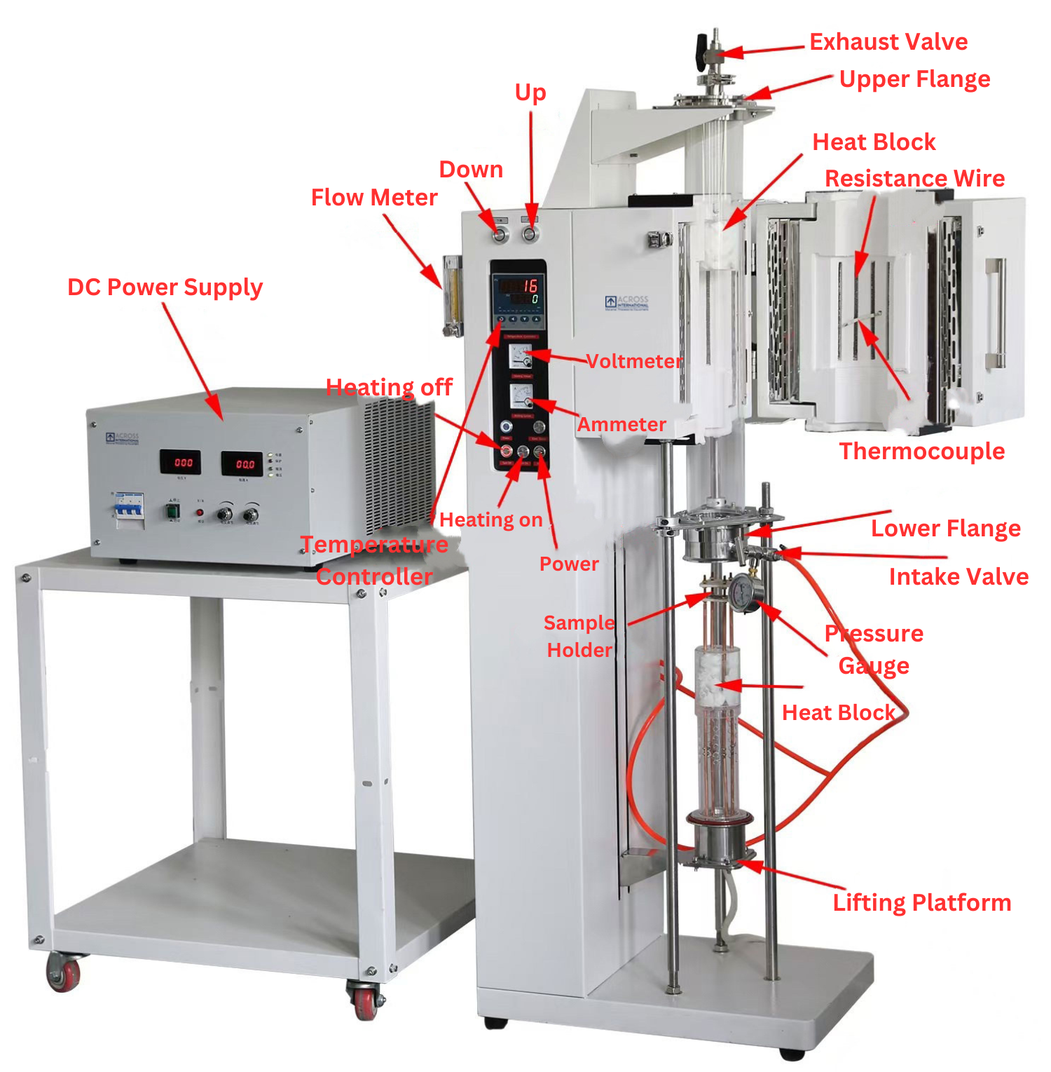 This is a Flash Sintering Furnace with preheating function, equipped with flash sintering power supply, through the electrode flange to introduce the current to the sample to apply an electric field, to achieve the Electric Current-Assisted Sintering (ECAS) processes, compared with the traditional ceramic sintering process, has the advantages of ultra-fast, energy-saving and conducive to the preparation of fine-grained ceramics, can be widely used in the flash sintering process of various ceramics.