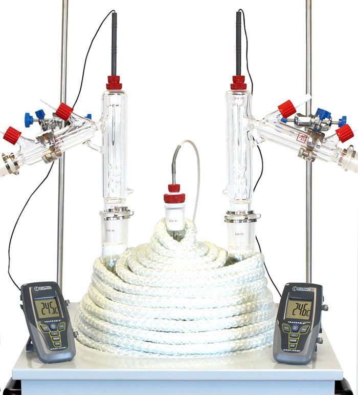 24/40 joint thermometer adapter with PTFE body and Viton O-ring for air tight vacuum work. Features Adapter has a threaded polypropylene screw cap on top with an inside O-ring for depth adjustment of 6-7mm for straight stem thermometers, glass tubing and other items Rotating the extracting nut removes the adapter from flask Not autoclavable