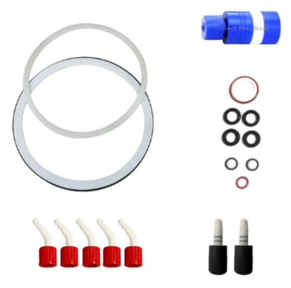 R Service Kit 2R50: 2R50, 2R50ex This service kit is made for use with Across International 2R50 & 2R50.ex dual jacketed glass reactors. The service kit is intended to replace the primary bearings and seals that may fail over time, as well as basic components that can be easily lost or broken. Items include PTE stir shaft bearing, GL 18 connectors, O-rings, centering rings, new PTFE open-close valve, and new hose bumpers.