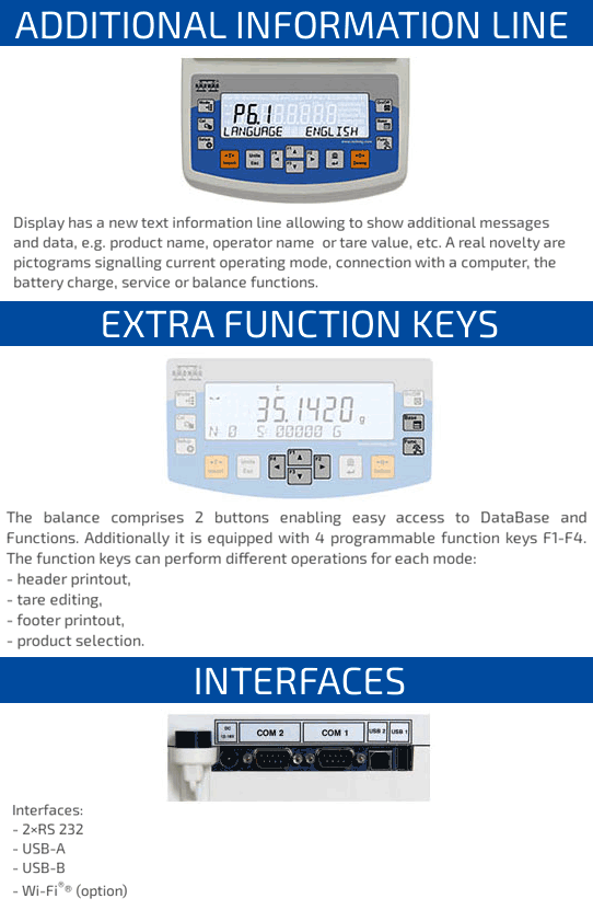 New PS.R2 balances, like previously designed PS series balances, have pans in two possible dimensions: 128×128 mm or 195×195 mm. balances with a smaller pan have a draft shield. The balance precision and the measurement accuracy is assured by automatic internal adjustment, which takes into consideration temperature changes and time flow. PS.R2 balances feature several communication interfaces: 2 x RS 232, type A USB, type B USB and optional Wireless Connection.