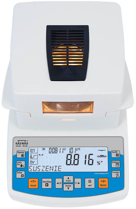 Radwag moisture analyzer is a laboratory measuring instrument intended to determine relative humidity for small samples of different materials. MA.R series redefines moisture analyzers standards. This series has been equipped with brand new readable LCD display providing an extra text line for information such as supplementary messages and data, e.g. product name or tare value.