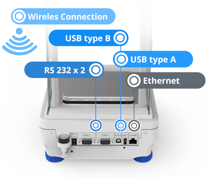 USB allows for fast transfer and copying of work results (measurements, reports, databases) to a computer or other weighing device. The balance provides possibility of remote data management.