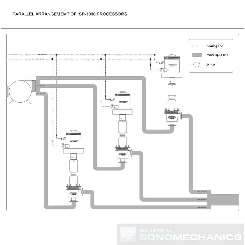 • The ISP-3600 processor utilizes patented Barbell Horn® Ultrasonic Technology (BHUT), which makes it possible to generate extremely high ultrasonic amplitudes at any scale of operation. With the ISP-3600, any process optimized with our smaller units, the LSP-600 or BSP-1200, can be directly scaled-up to an industrial production environment, while maintaining the same processing conditions and reproducible results. Further scale-up is possible by placing several ISP-3600 processors in parallel and/or in series (see schematics on the left).