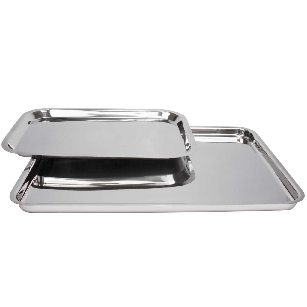 The stainless steel instrument trays have a raised outer edge, helping contain items placed within the pan.