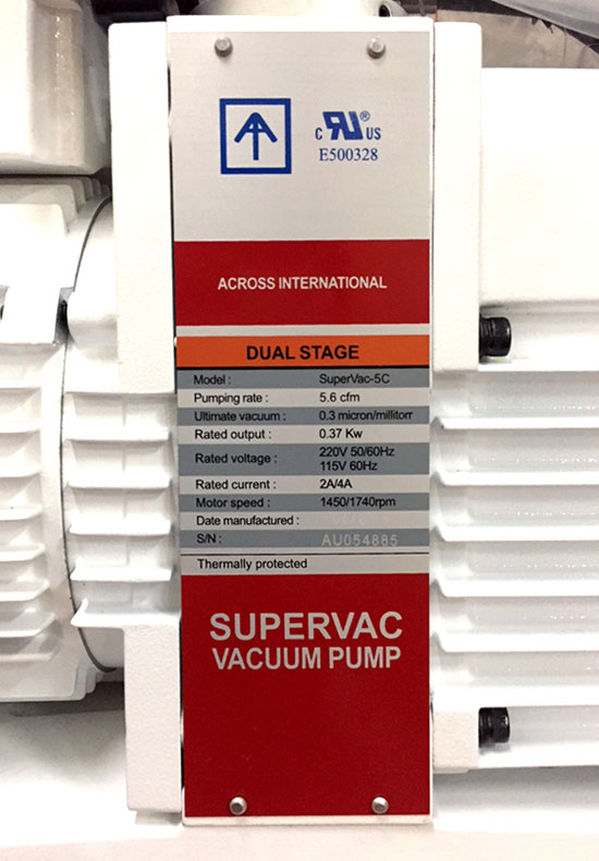Ai SuperVac-5C 5.6 cfm commercial grade vacuum pump now come standard with UL certified, this certification is required by many municipalities, and it also provides a higher standard of equipment safety and lifespan. These pumps are also corrosion resistant and 115V/230V 50/60Hz switchable, backed by our 2-year warranty.