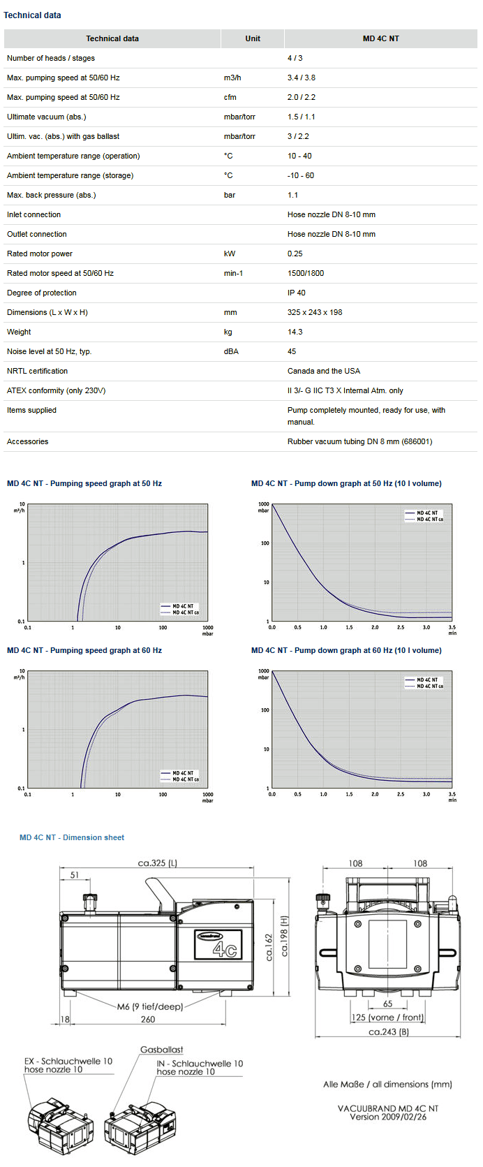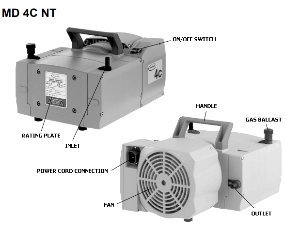 Vacuubrand MD 4C three-stage chemistry-design diaphragm pumps are an excellent solution for continuous, oil-free pumping of corrosive gases and vapors and meet even challenging requirements. The three-stage design provides the advantageous combination of high pumping speed and very low ultimate vacuum . All parts of the MD 4C NT in contact with pumped media are made of chemically resistant fluoroplastics. Well-proven PTFE sandwich diaphragms provide increased reliability and extended operating life.