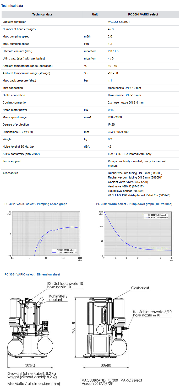 The PC 3001 VARIO select pumping unit precisely controls the vacuum level in order to achieve unparalleled process control. This pump is suitable for even high boiling point solvents. The integrated VACUUSELECT controller provides an easy-to-use, application based interface that covers all common lab applications. The VACUUSELECT controller has you covered. Use manual set-point-control for simple processes, run fully automated distillations, or create your own application with simple drag-and-drop editing. For solvent evaporation, the VACUUSELECT controller detects solvent boiling and automatically adjusts the pump’s motor speed to maintain process control. The VARIO motor speed control also makes the pump whisper quiet and provides for exceptionally long maintenance intervals.Self-adjusting vacuum pump system features a 1.2 cfm (34 L/min) free air capacity making it ideal for coupling with benchtop rotary evaporators. As the system continually adjusts to changing vapor conditions, it minimizes bumping and foaming, making it safer for your samples. Complete pump system is composed of a Vacuubrand oil-free pump and digital vacuum controller with integral solvent recovery system.